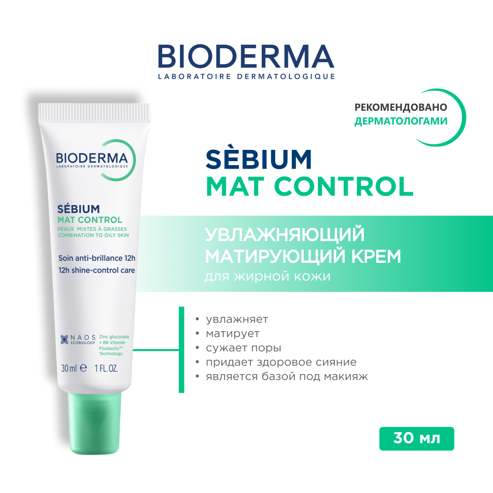 Bioderma Sebium Mat Control 30 ml — майлы және аралас теріге арналған инновациялық күңгірт крем. Ол себум өндірісін тиімді басқарады, майлы жылтырды кетіреді және теріні балғын және жақсы күтімді ету үшін 8 сағатқа дейін ұзақ күңгірт әсер береді.