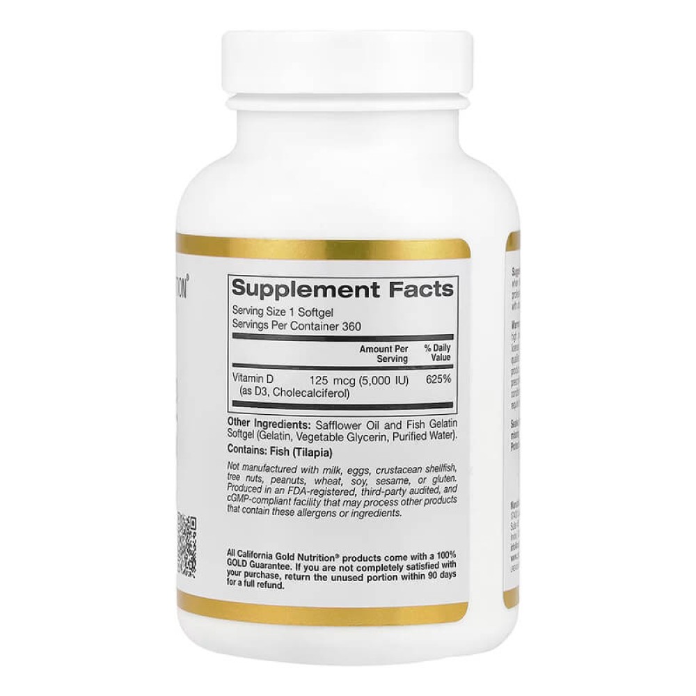 California Gold Nutrition Vitamin D3 — бұл холекальциферол түріндегі ""күн витаминінің"" көзі, ол күшті иммунитетті, сүйек денсаулығын және жалпы әл-ауқатты жақсартады. D3 дәрумені кальций мен фосфор алмасуына қатысады, жүректің, қалқанша безінің және бұлшықеттің жұмысын қолдайды және созылмалы аурулардың алдын алуға көмектеседі.