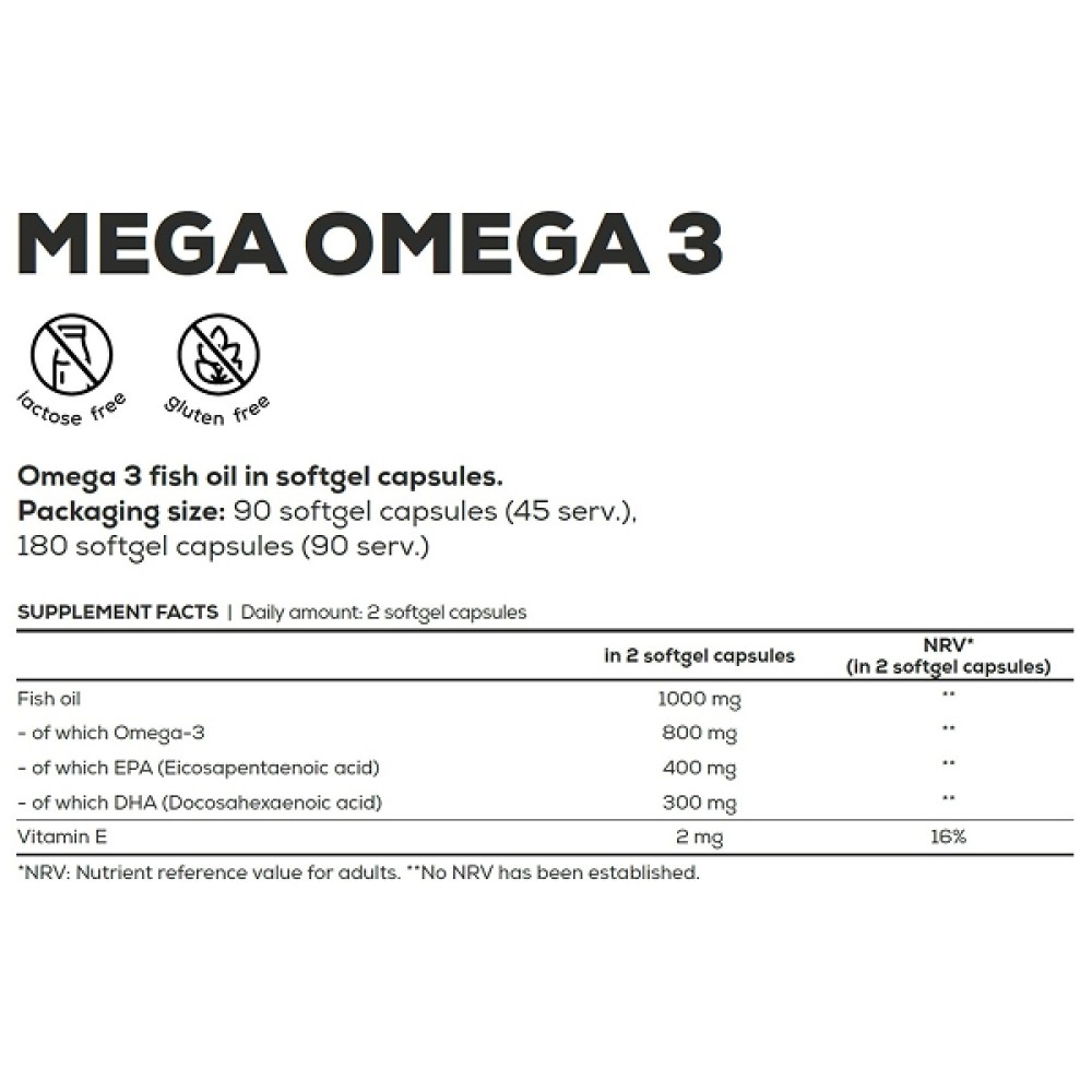 BioTech USA Mega Omega 3 180 капсула — бұл жүрек, қан тамырлары, ми және буын денсаулығын қолдау үшін қажет маңызды омега-3 май қышқылдарының (EPA және DHA) көзі. Өнім күнделікті қолдануға және диетадағы пайдалы майлардың жетіспеушілігін толтыруға арналған.