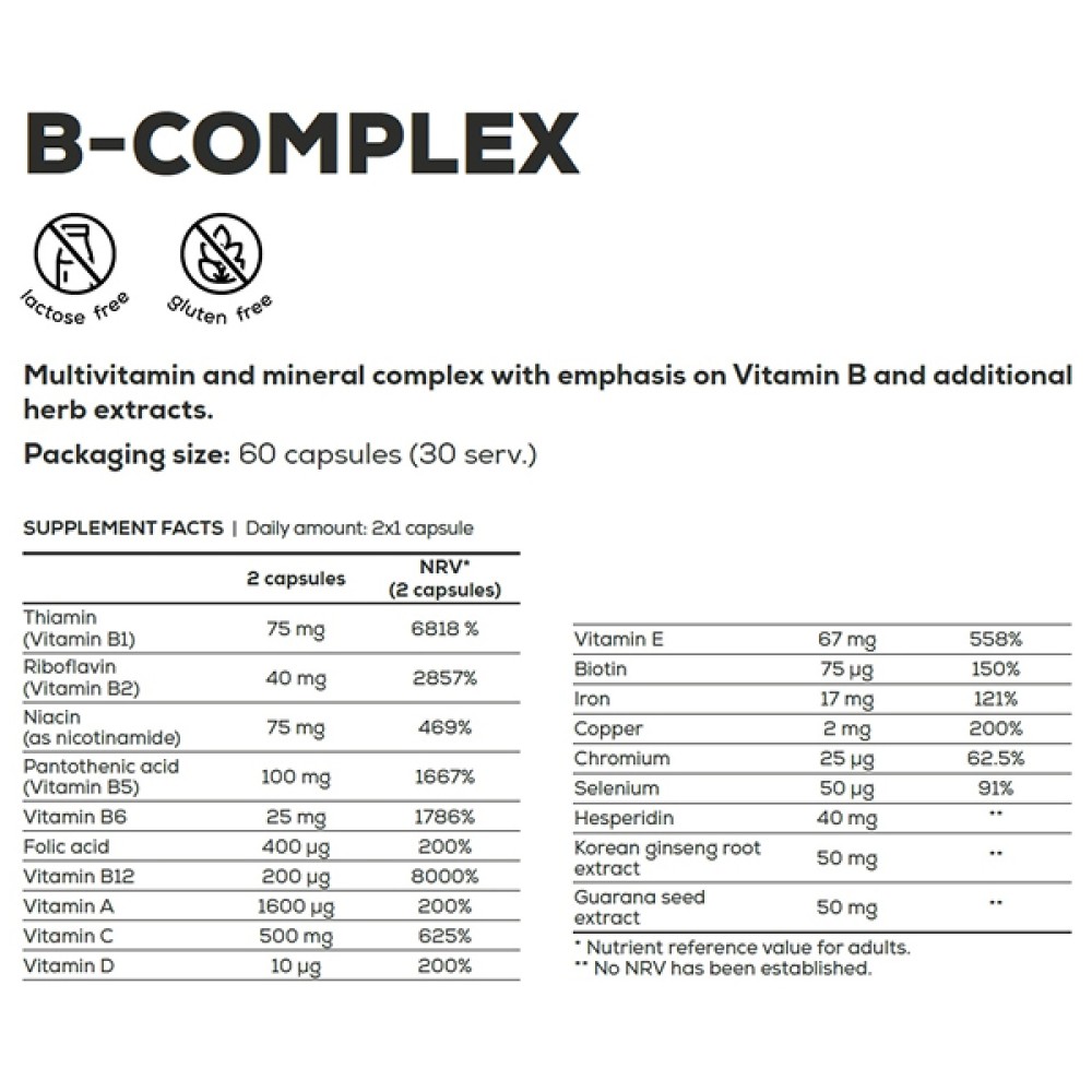 BioTech USA Vitamin B Complex 60 таблетка — бұл энергия алмасуын, жүйке жүйесінің қалыпты жұмысын және шаршауды азайтуға қажетті В дәрумендерінің кешені. Формула ағзаның өмірінде маңызды рөл атқаратын негізгі дәрумендерді (B1, B2, B3, B5, B6, B7, B9, B12) қамтиды.