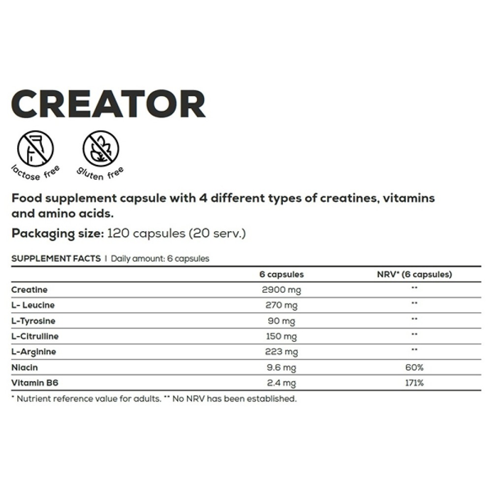 Креатин (микронизацияланған моногидрат креатиндер, буферленген моногидат креатиндер, пируват креатиндері, цитрат креатиндері) 2900 мг, L-лейцин 270 мг, L-тирозин 90 мг, l-цитруллин 150 мг, L-аргинин 223 мг, Ниацин 9,6 мг, В6 дәрумені 2,4 мг