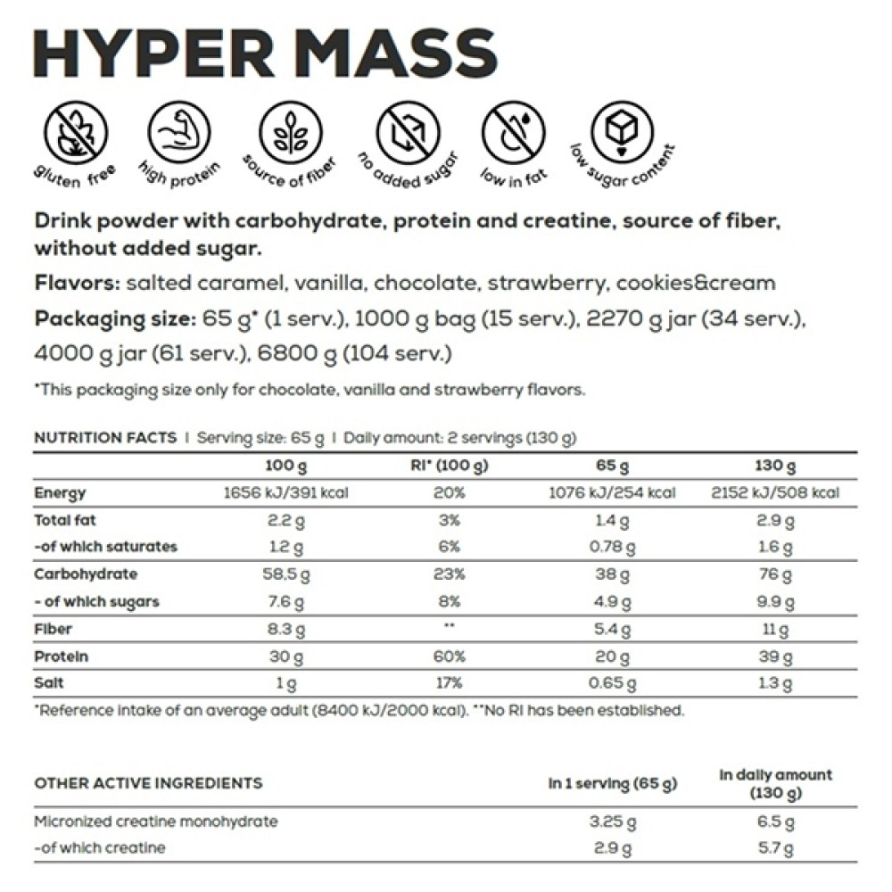 BioTech USA Hyper Mass vanilla 1000 g — бұл бұлшықет массасын тиімді арттыруға және қарқынды жаттығулардан кейін энергияны толықтыруға арналған жоғары калориялы гейнер. Өнім жоғары сапалы ақуыздар мен көмірсуларды біріктіріп, денені бұлшықеттердің өсуіне және қалпына келуіне қажетті қоректік заттармен қамтамасыз етеді.