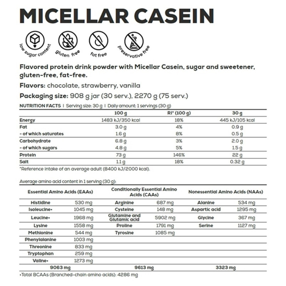 BioTech USA Micellar Casein vanilla 908 g — бұл бұлшықеттерді ұзақ уақыт тамақтандыруға және олардың бұзылуына жол бермеуге арналған аминқышқылдарының баяу шығарылатын жоғары сапалы казеин протеині. Ұйықтар алдында немесе тамақ арасындағы ұзақ үзілістер кезінде қабылдауға өте ыңғайлы.