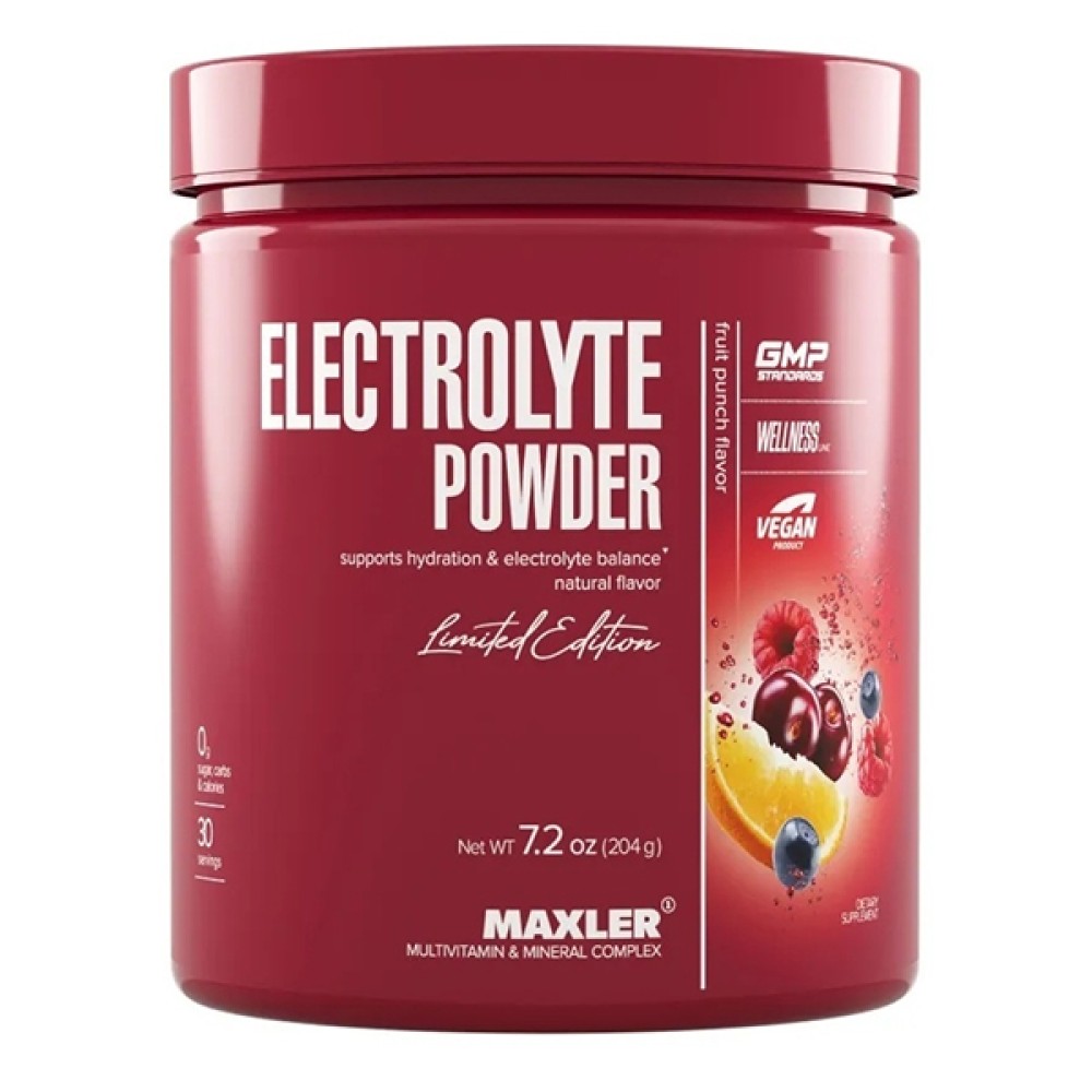 Maxler Electrolyte Powder Fruit Punch 204 g — надежный источник электролитов для здоровья, энергии и максимальной эффективности ваших тренировок.