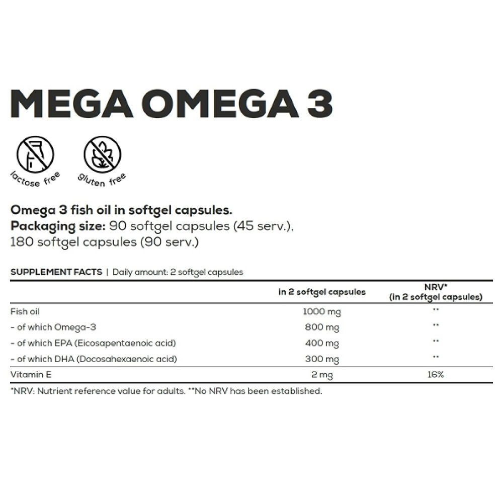 BioTech USA Mega Omega 3 90 капсул — это источник незаменимых омега-3 жирных кислот (EPA и DHA), необходимых для поддержки здоровья сердца, сосудов, мозга и суставов. Продукт разработан для ежедневного применения и восполнения дефицита полезных жиров в рационе.